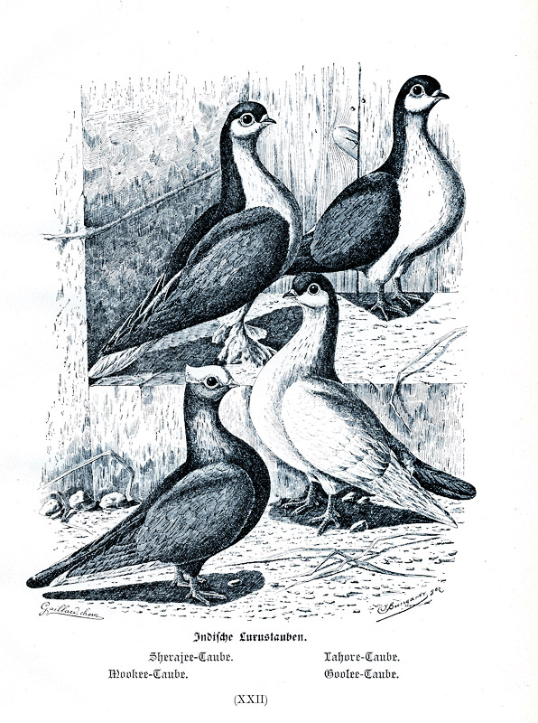 Im nebenstehendem Bild, das aus dem 1984 erschienenem Buch von Bungartz, Taubenrassen,ent-nommen ist, kann man erkennen, dass unsere heutigen Lahore wohl eher die Sherajee Tümmler als Ahnen haben, denn die dar-gestellte Lahore-Taube ist glatt-füssig. Auch weisen unsere heutigen Lahore einen hellen Oberschnabel auf. Bungartz führt beide Taubenrassen als Indische Luxustauben auf.